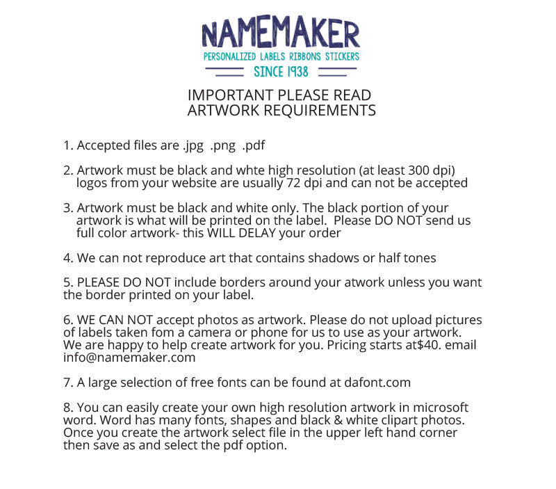 CAN I USE MY OWN LOGO/ARTWORK/SPECIAL FONT?Yes, we offer completely custom printed labels & custom printed ribbon with your logo/artwork. NEED HELP with formatting or creating your artwork please call, fax or write us with your requirements.