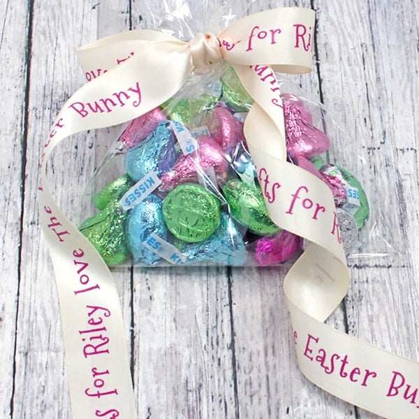 Personalized Ribbons for Easter can make your gifts, Easter baskets, and egg hunts really stand out. Our ribbons can be personalized with your child's name, a special Easter greeting, or anything you desire. Choose from several ribbon widths, hundreds of color combinations, fonts and imprint colors. Personalized Easter ribbons will create years of memories for that someone special.