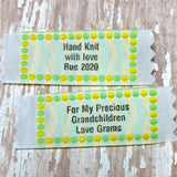 A modern flare gives these yarn balls and knitting needles an updated look. These fabric labels are woven in multi...