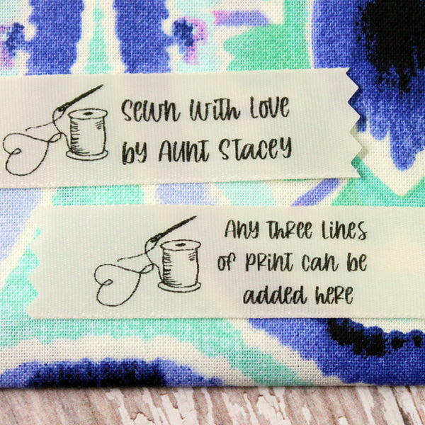 Select one to three lines of print that will appear next to the Spool with Heart thread design. Labels measurements...