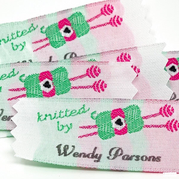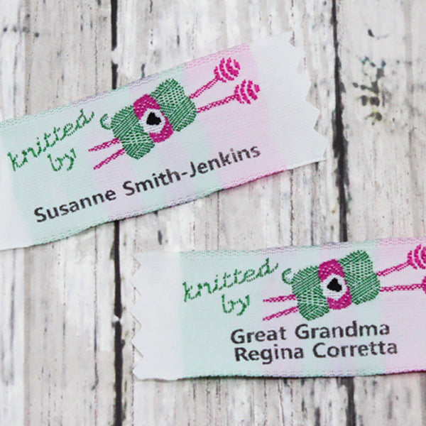 Clothing Label Style 61 Knitted ByKnitted By Labels with yarn and needles are woven in green, pink & white and black thread. Choose the text...
