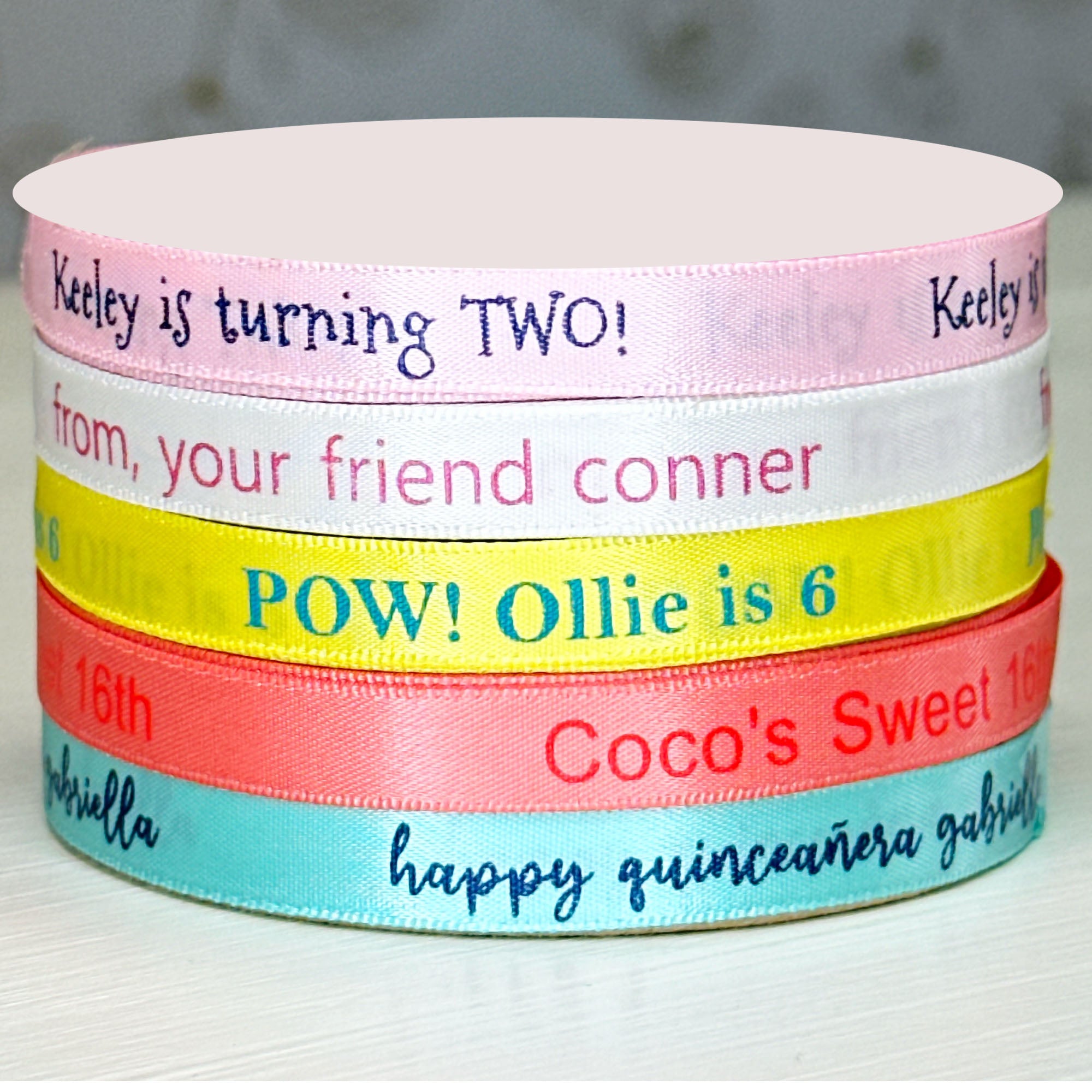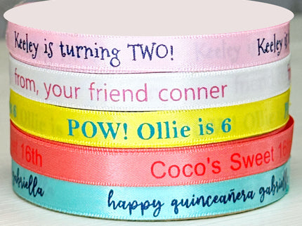 Personalized Birthday Ribbon 3/8" - 36 ColorsOur beautiful 3/8 inch personalized satin ribbon comes on a continuous roll so you can cut exactly where you need...