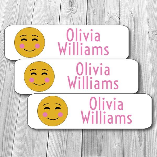 Blush Emoji Mini Waterproof StickerMeasures .5" x 1.75" up to 3 lines of text enter your wording and we will adjust font size according...