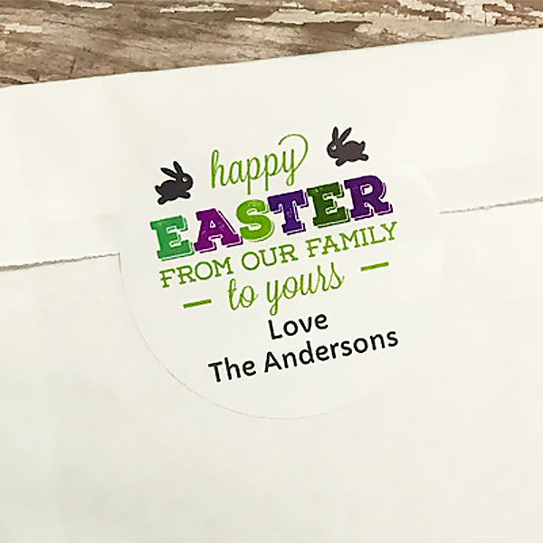 Happy Easter Bunnies Gift StickersEaster Egg Stickers are perfect for all of your Easter gifts. These Gift stickers measure 2 1/2" round. Font as...