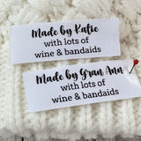 Made by (Name) with lots of wine band-aidsTell them how you really feel with our new "Made by (name) with lots of wine and band-aids" satin printed...