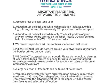 CAN I USE MY OWN LOGO/ARTWORK/SPECIAL FONT?Yes, we offer completely custom printed labels & custom printed ribbon with your logo/artwork. NEED HELP with formatting or creating your artwork please call, fax or write us with your requirements.